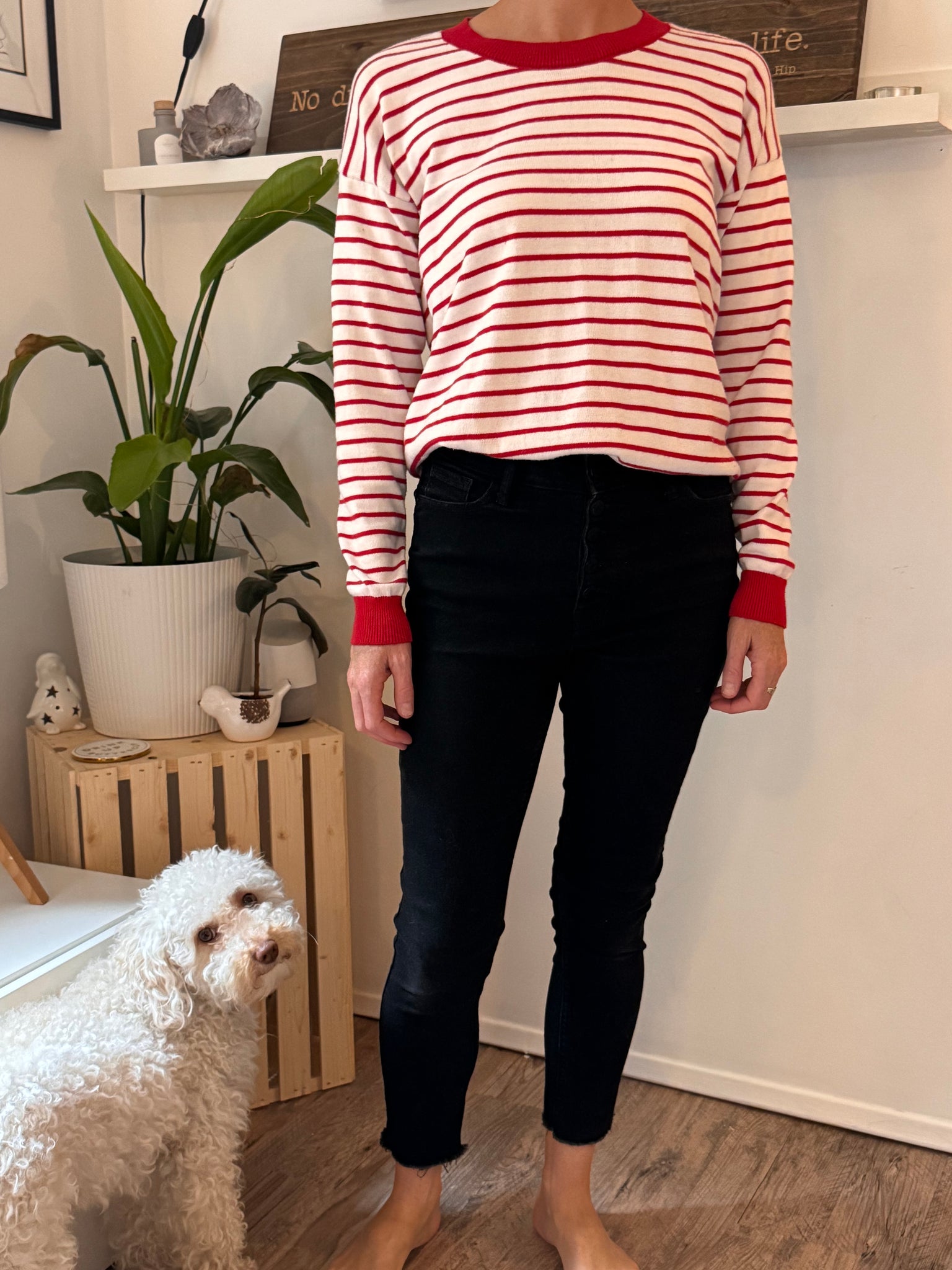 Playful, cozy and effortlessly chic. Featuring classic red and white stripes with bold red trim at the collar and cuffs, it's the kind of piece that makes you feel instantly put together.
